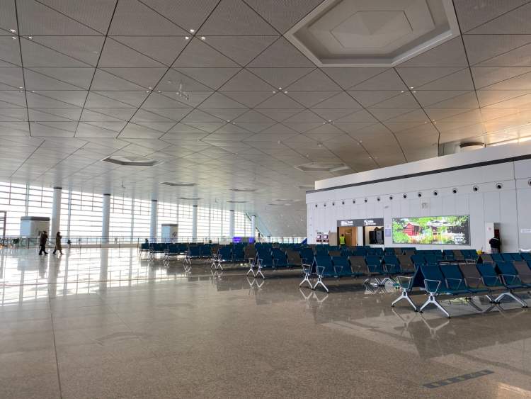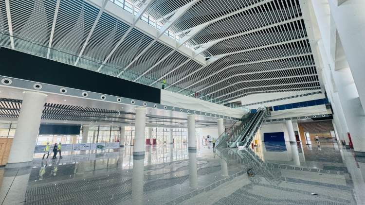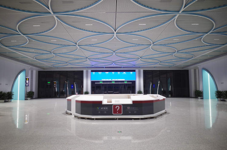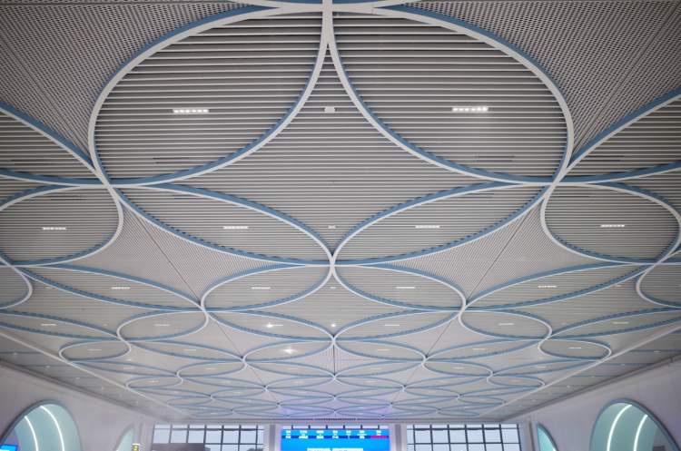 候车大厅融合了练塘拱桥元素和荷叶元素,吊顶通过层叠关系和镂空设计,形成了层叠的荷叶造型,营造出独特的光影效果。