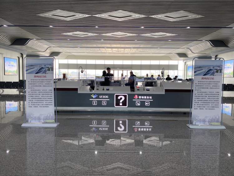 候车室一侧嵌壁式灯柱像一支支矗立的巨型“湖笔”,将湖州的湖笔非遗文化元素融入站房设计。排列在电子显示屏两侧的空调风口,也别具匠心,一个个南浔文化特色Logo分布其中。候车大厅内更是随处可见融入江南水乡特色的线条造型,水墨渲染,尽显江南别致韵味。