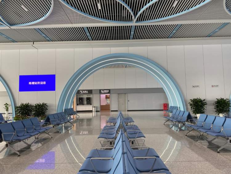 站房装饰颜色提取了“荷塘月色”所代表的历史古色,选用茭白、天青蓝等应用于室内外装修,不仅增加空间的变化和层次感,还将练塘自然元素引入室内,让旅客在等待的过程中感受到自然之美和艺术之韵,使练塘的地区文脉和地域特色得以充分呈现,为旅客带来沉浸式的文化艺术出行体验。