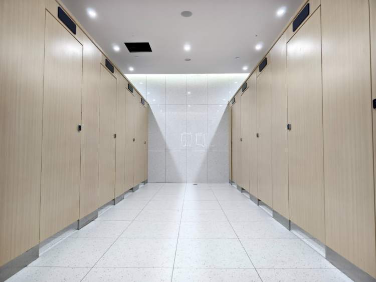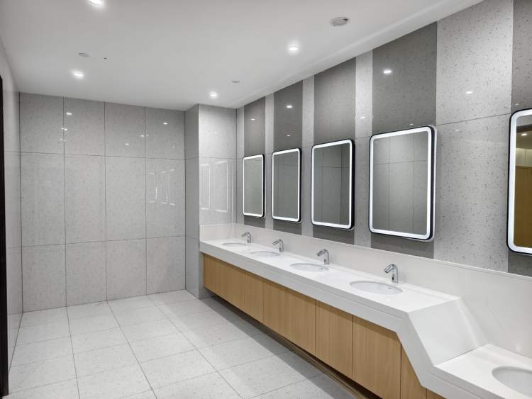 上海站练塘站站长朱强介绍,练塘站的卫生间墙面装饰运用了古镇剪影元素,增添传统文化韵味。
