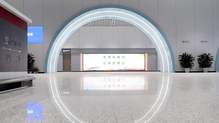 桥墩柱装饰运用了拱桥元素,使柱子的形状与拱桥相呼应,赋予空间美感和流线型的外观。出站厅天花采用铝板和格栅相结合的形式,融合了荷叶的形状和纹理,体现了“接天莲叶无穷碧”的视觉感受。
