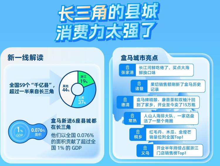 在全国59个“千亿县”中,超过一半来自长三角地区。今年盒马进入了其中6强:常熟、桐乡、义乌、诸暨、德清、张家港。
