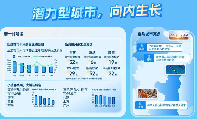 春节将近,最新发布的《2024盒区房消费趋势洞察报告》(下简称《报告》)显示,盒马今年共开出72家新店,其中三分之一位于二三线城市及县城,中山盒马首店开业一天卖了105只帝王蟹和410只大波龙;东营盒马开业当天仅烘焙就卖了40多万……在新供给和新体验的双重促进下,这些城市正迸发出惊人的消费活力。