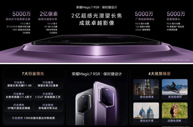 荣耀Magic7 RSR保时捷设计版,在本次发布会上也公布了完整的产品规格,拥有行业领先2亿像素超感光潜望长焦,搭载行业更大底的1/1.4英寸长焦传感器,以及行业更大潜望长焦光圈f/1.88,让进光量提升98%,实现了业界长焦镜头的更强感光能力;搭配领先I-CUT非球面玻璃镜片加工工艺和行业领先的5P镜片超低反镀膜,大幅提升暗光拍摄效果,引领业界暗光长焦极限解析力和综合效果的突破,让长焦暗光拍摄画质更佳,长焦大光圈虚化更有质感,长焦微距更清晰更好用。