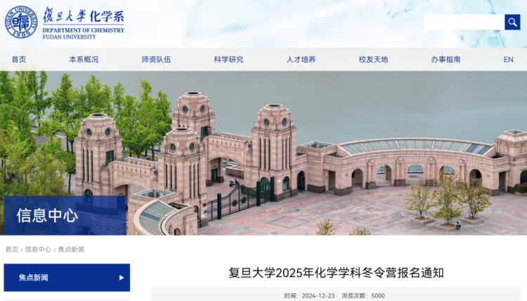 为全面贯彻党的二十大精神,进一步加强拔尖创新人才选拔培养,复旦大学化学系将于2025年1月11日-12日举办化学学科冬令营,面向全国在化学领域具有学科特长和创新潜质的高三学生开放报名。
