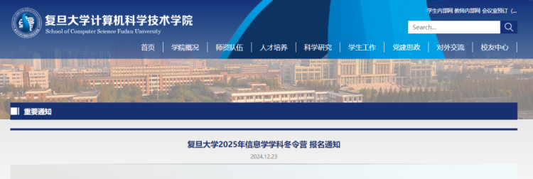 为全面贯彻党的二十大精神,进一步加强拔尖创新人才选拔培养,复旦大学计算机科学技术学院将于2025年1月11-12日举办信息学学科冬令营,面向全国在信息学领域具有学科特长和创新潜质的高三学生开放报名。