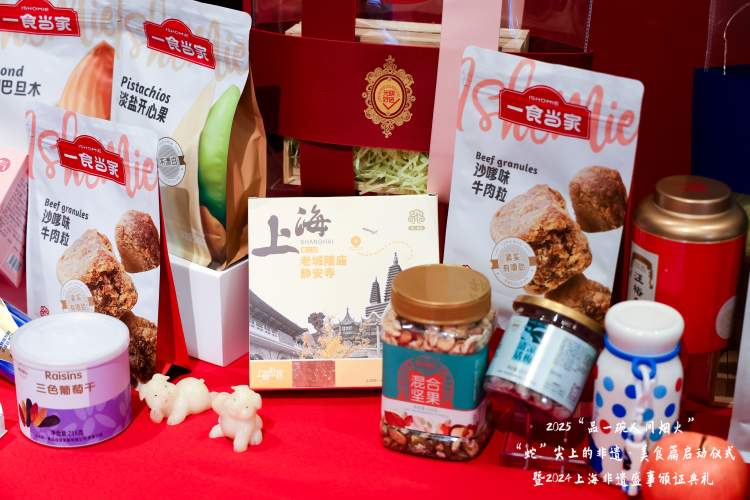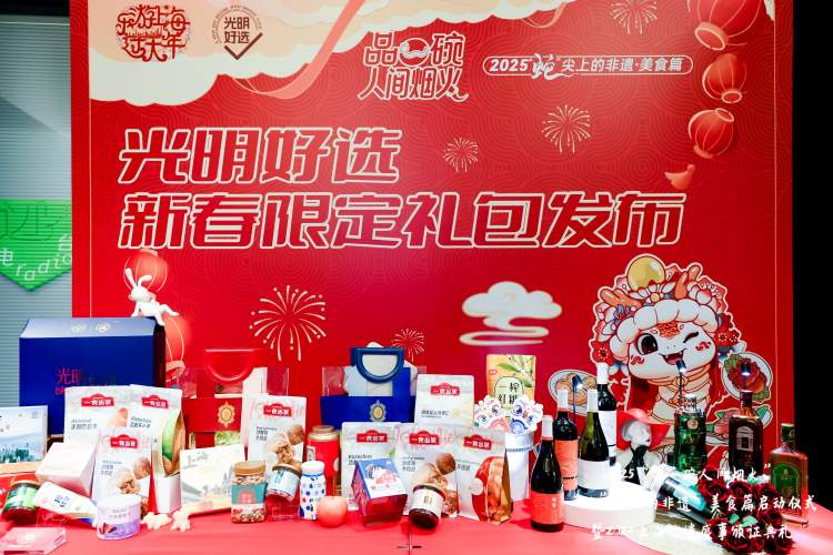 开幕仪式上,发布的3款“光明好选”新春限定礼包,包含了自有品牌 “一食当家”、文旅合作 “一盒上海”、老字号品牌 “玉棠”、“汪裕泰”、 “大白兔”等20余件光明明星产品,在“光明好选”小程序和第一食品南京东路店同步发售,不同的产品组合不仅体现了沪上的年味美食,更彰显着海派传统文化的魅力,传递中国新年的喜庆氛围和美好祝愿。此外,第一食品还准备了大量新年周边和优惠券作为新年礼物回馈给广大消费者。同时,上海糖酒集团进行了上海礼物的焕新发布,未来将在老字号保护和焕新的实践中,通过文旅及古镇等渠道合作共建来拓展品牌、资源整合,赋能传统文化,推动传统品牌的复兴。展望新的一年,回顾丰收满满的2024年,第三届非遗国潮文创大赛、 “进博会非遗客厅”、“世界会客厅”、“国宴非遗展示”、“非遗里的中国”上海篇等重大非遗事件入选2024年度非遗大事件,颁证颁奖典礼也随之举办。