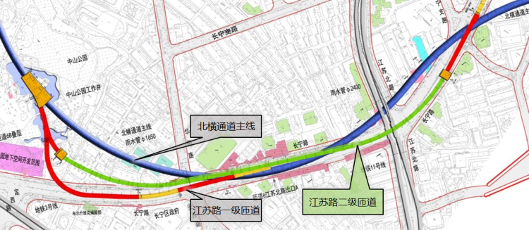 北横通道江苏路二级出口匝道西起江苏路一级出口匝道分合流点,与江苏路一级出口匝道同与西段主线相连;东至万航渡路,全长约1.2公里,为单车道+紧急停车带,小客车专用,通行限高3.0米,匝道设计时速30公里每小时。