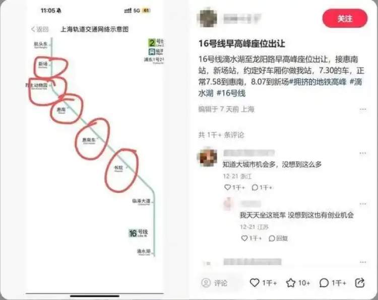 “16号线滴水湖至龙阳路早高峰座位出让,接惠南站,新场站,约定好车厢你做(坐)我站,7.30的车,正常7.58到惠南,8.07到新场。”