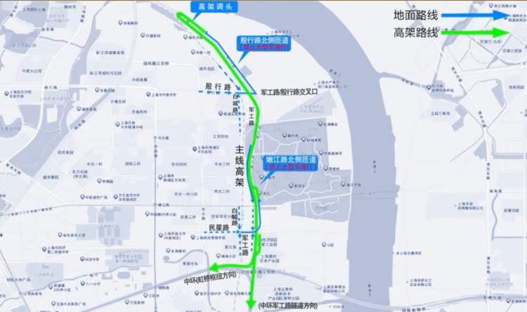 2. 施工期间,临时开放军工路高架部分主线道路作为上中环保通线路,该地区三处匝道可上高架通往中环。
