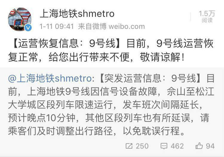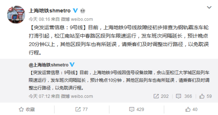 钢轨霜冻车轮打滑 上海地铁9号线今早限速运行 2018-1-11 今天早上,上海地铁9号线因信号设备故障,松江大学城至佘山区段列车一度限速运行。 据@上海地铁 官方微博消息,目前,上海地铁9号线故障经初步排查为钢轨霜冻车轮打滑引起,松江南站至中春路区段列车限速运行,发车班次间隔延长,预计晚点20分钟以上,其他区段列车也有所延误,请乘客们及时调整出行路径,以免耽误行程。 上午09:41,上海地铁官方微博再次发出消息:9号线运营恢复正常。 ■本文封面图片来源:新民网 赞一个 (0)