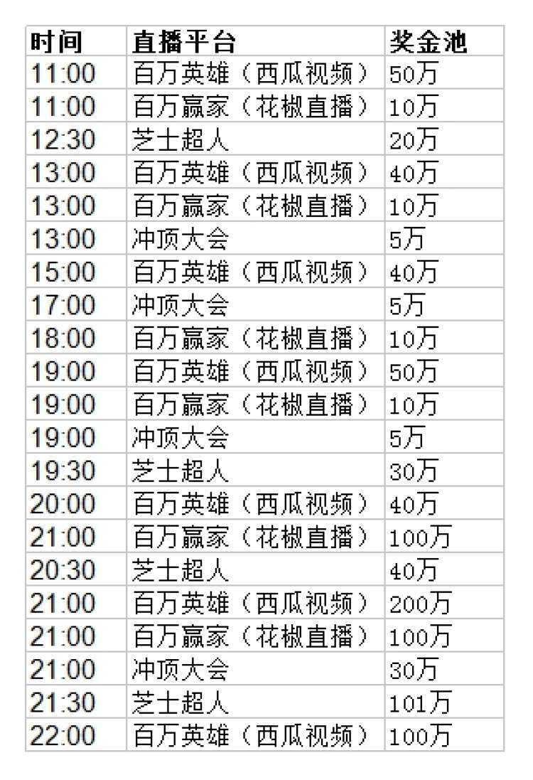 《百万英雄》、《芝士超人》和《百万赢家》在奖金上远胜《冲顶大会》,在夜间都有百万场。其中《百万英雄》是最壕的,每场的奖金不少于40万。