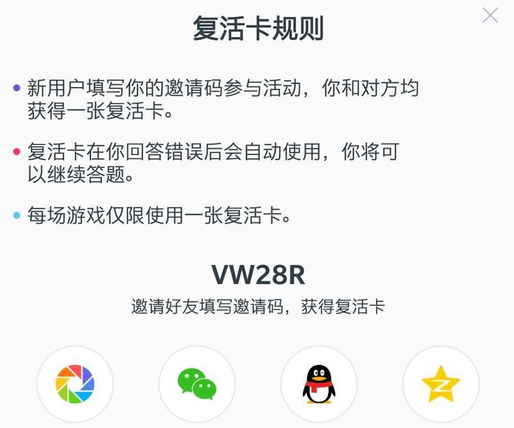 《冲顶大会》和《百万英雄》玩法相似。输入邀请码可得一张复活卡,每场只能用一次。接下来,你就要通过别人用你的邀请码来获得生命了——去发微博和到应用市场留言吧!