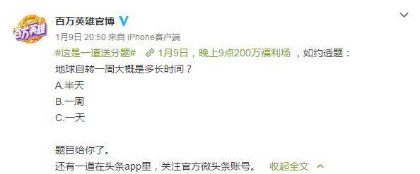 它们会在自己的官微上泄露一道题的答案,《百万英雄》更是会在微博和今日头条微头条上各泄露一道题,千万不要错过了。