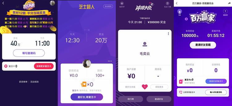 根据周到君的个人体验,4个平台在答题过程中都没有出现过严重的卡壳,但是《芝士超人》出现过只有选项没有题的情况。《百万英雄》的使用体验最佳,你可以不用盯着画面看什么时候弹题,因为题目弹出时会有手机震动,就算在后台也会提醒。