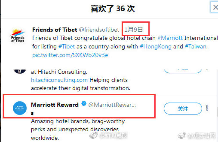 网友发现,在美国社交网络及微博客服务的网站twitter上,名为“Marriott Rewards”(中文名即“万豪礼赏”)的账号公然点赞了一条内容为支持藏独、港独和台独的twitter信息。“万豪礼赏”点赞的微博信息网名“Friends of Tibet”(中文译名:“西藏之友”)所发布,该信息内容为“Friends of Tibet congratulate global hotel chain Marriott international for listing Tibet as a country along with HongKong and Taiwa.”翻译成中文的意思为:西藏之友祝贺全球连锁酒店万豪国际集团将西藏和香港、台湾一起列为“国家”。而在该条带有明显分裂中国色彩的博文信息点赞者名单中,“Marriott Rewards”(“万豪礼赏”)的账号赫然在列。