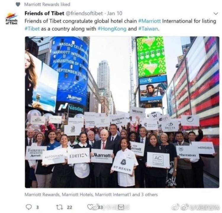 据悉,“Marriott Rewards”(“万豪礼赏”)是万豪酒店集团针对其会员推出的奖励计划,官方账号也代表了万豪酒店集团,万豪礼赏正是万豪将西藏列为“国家”一事的“始作俑者”。刚刚因为此事,“万豪礼赏”通过其在新浪微博的官方账号连续发布两条声明公开道歉,并表示“我们已采取措施确保类似错误不再发生。万豪国际集团在此重申我们尊重中国主权和领土完整的一贯立场。”