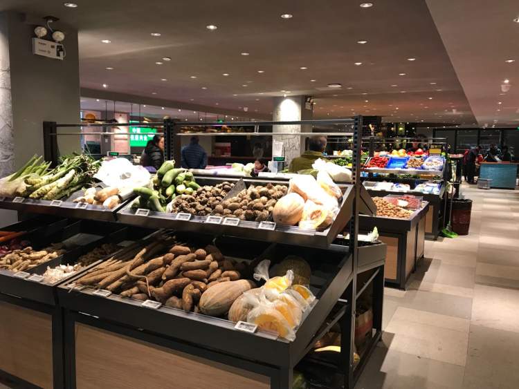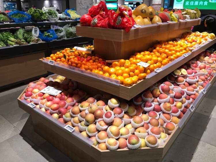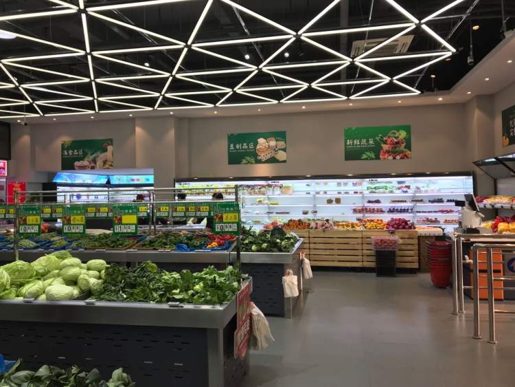 在普济路上的万有集市静安店,棕色的门楣、摆放有序的深色格子柜展示出浓浓的超市范儿。这里的二、三楼尚未向顾客开放,一楼设有蔬菜、水果、猪肉、牛羊肉、水产、粮油副食品等区域,全部为开架式销售,顾客可以在货架上自行选购。