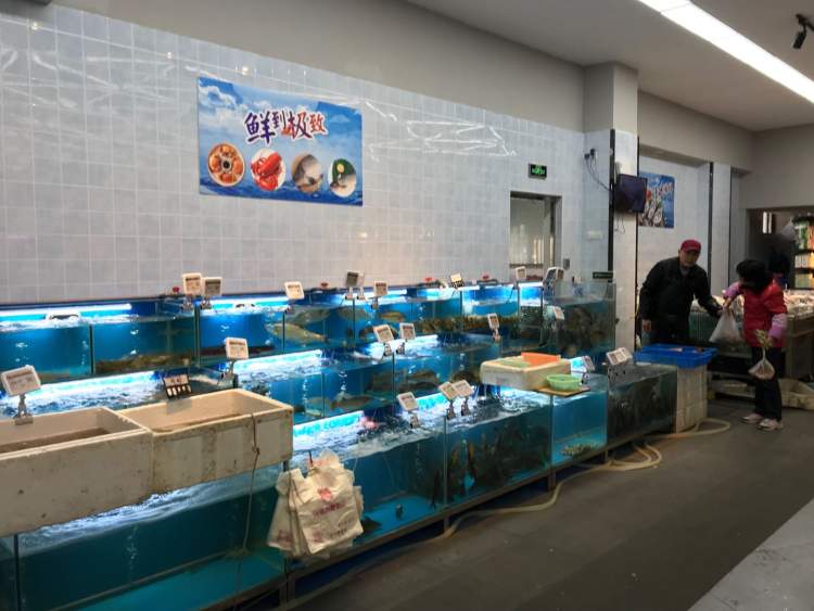 盛政都市农超中海菜市场位于芷江西路街道中海万锦城二期东侧一幢二层小楼内,距离天目西路街道的上海火车站北广场仅数百米远,是在原有1.0版菜场的基础上改建的。黑色门头上,一行白色圆体大字标示了菜场的名称。菜场设在一楼,楼上是管理方的办公区。记者看到,菜场分为蔬菜区、肉类区、冻品区、水产区、南北货区、生活用品区,菜品采用开架自选的模式出售,过道宽松,大理石地面非常干净,水产区地面也没有出现湿滑现象。工作人员会随时清理地上的菜皮、垃圾、水渍,保障地面干净整洁。