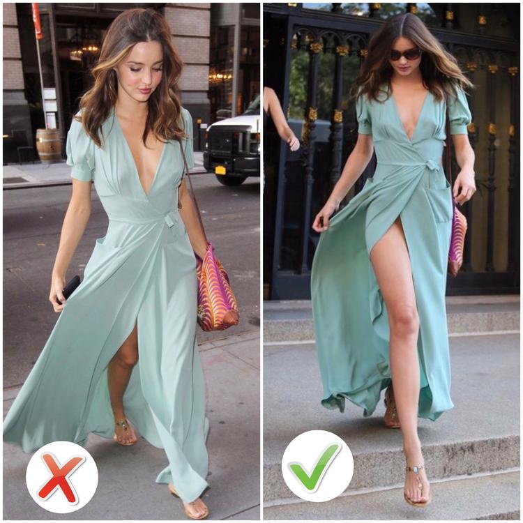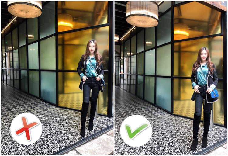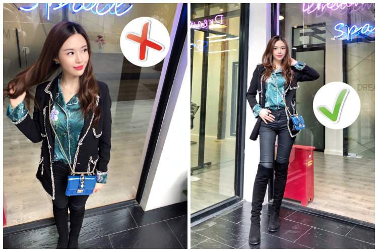还有一个秘诀就是双脚的摆放,脚尖一定要向镜头前延伸(如右下图),除非你是大长腿,那就360° 任意拍,可以completely忽略本文。↓