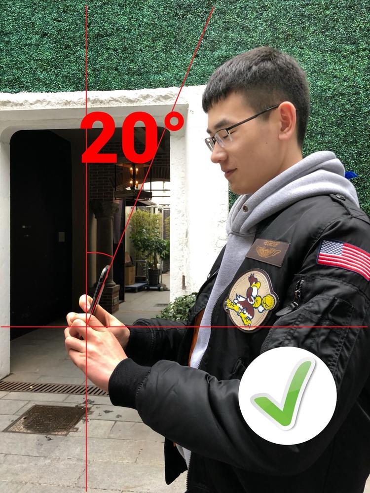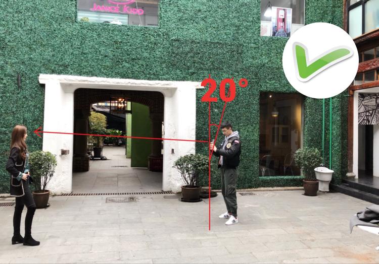 让男盆友先把手机垂直竖起,放在胸口前,如果是180以上的长腿欧巴,那就记得多一个步骤,稍微往胸口下方移动约5厘米这样,然后将手机往后仰约20°左右(如下图操作 )↓