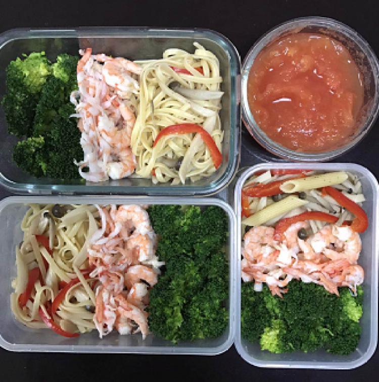左上角的是午饭,包括蔬菜(如番茄、西兰花、芹菜等)、蛋白质(鸡肉、虾仁等)、主食(藜麦饭、意大利面等)。
