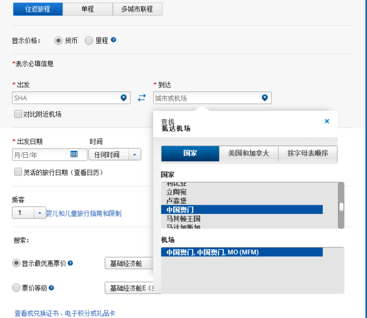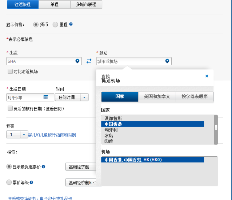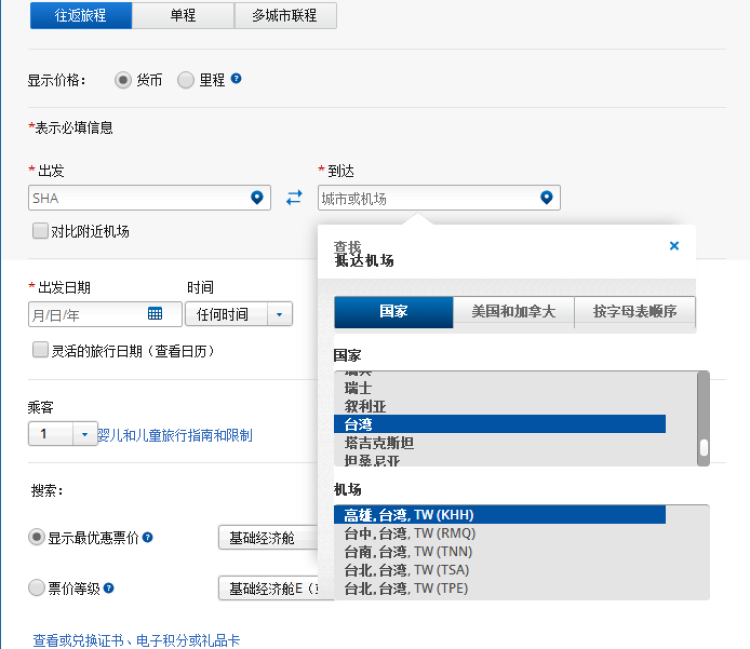 在“预订行程”页面,选择“到达”,在国家一栏中,可以看到台湾赫然与其他国家并列。