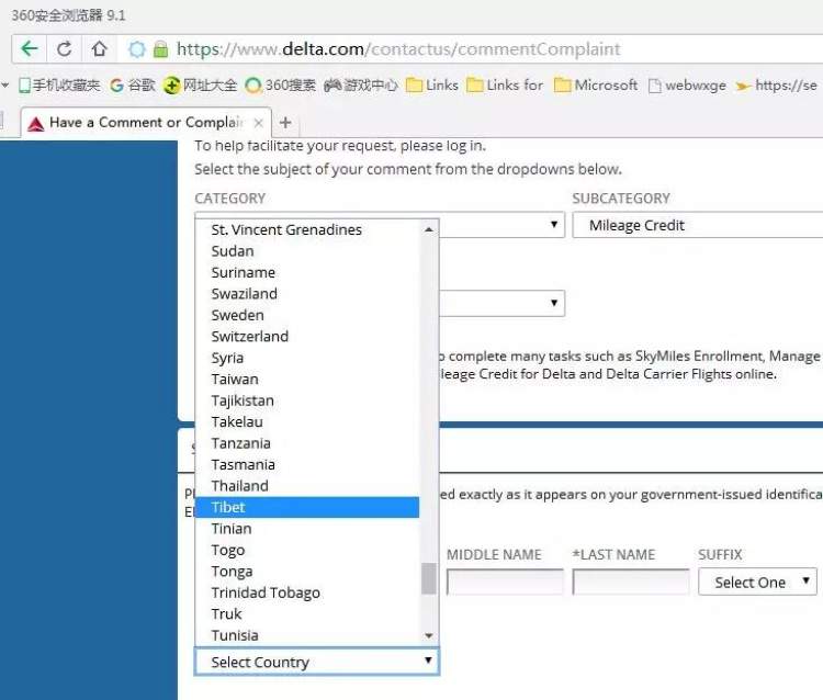 每周有多个航班往返中美各地的达美航空,其官网的旅程页面和意见和投诉区域,将台湾列为单独的国家。其中意见和投诉区域,西藏也被列为单独的国家。