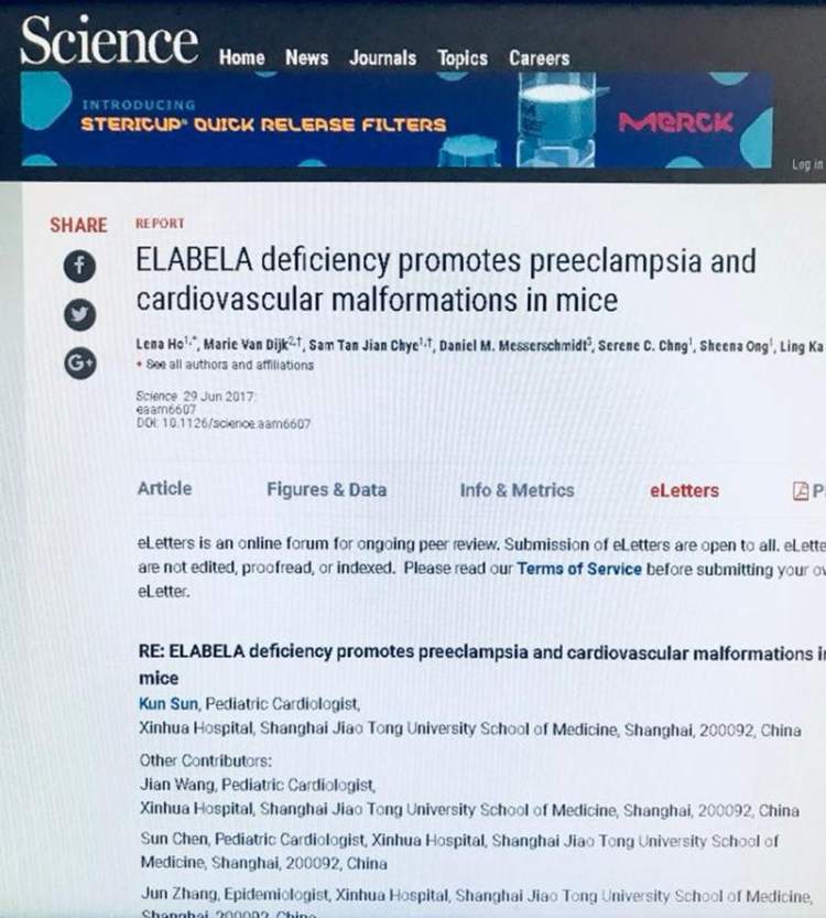 2017年,国际上一些研究者发现,敲除ELABELA基因的怀孕小鼠表现出类似先兆子痫的症状,由于ELABELA缺失导致母鼠胎盘和胚胎的血管异常,进一步导致尿蛋白和血压升高。当研究者尝试给怀孕小鼠补充外源性ELABELA激素时,发现怀孕小鼠先兆子痫的症状(高血压、蛋白尿、后代出生体重低)均恢复正常。