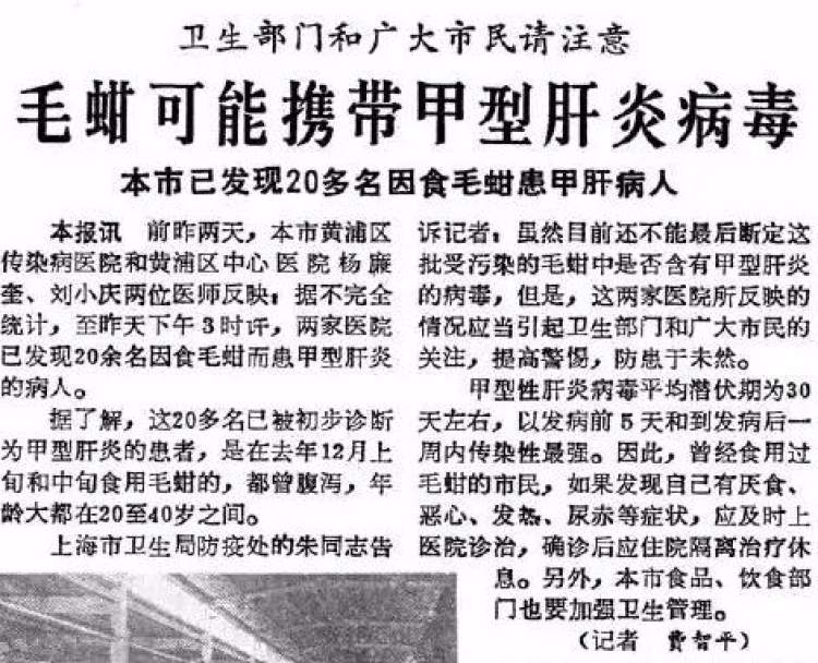 ■1988年1月18日,《解放日报》刊文警示毛蚶可能携带甲肝病毒。