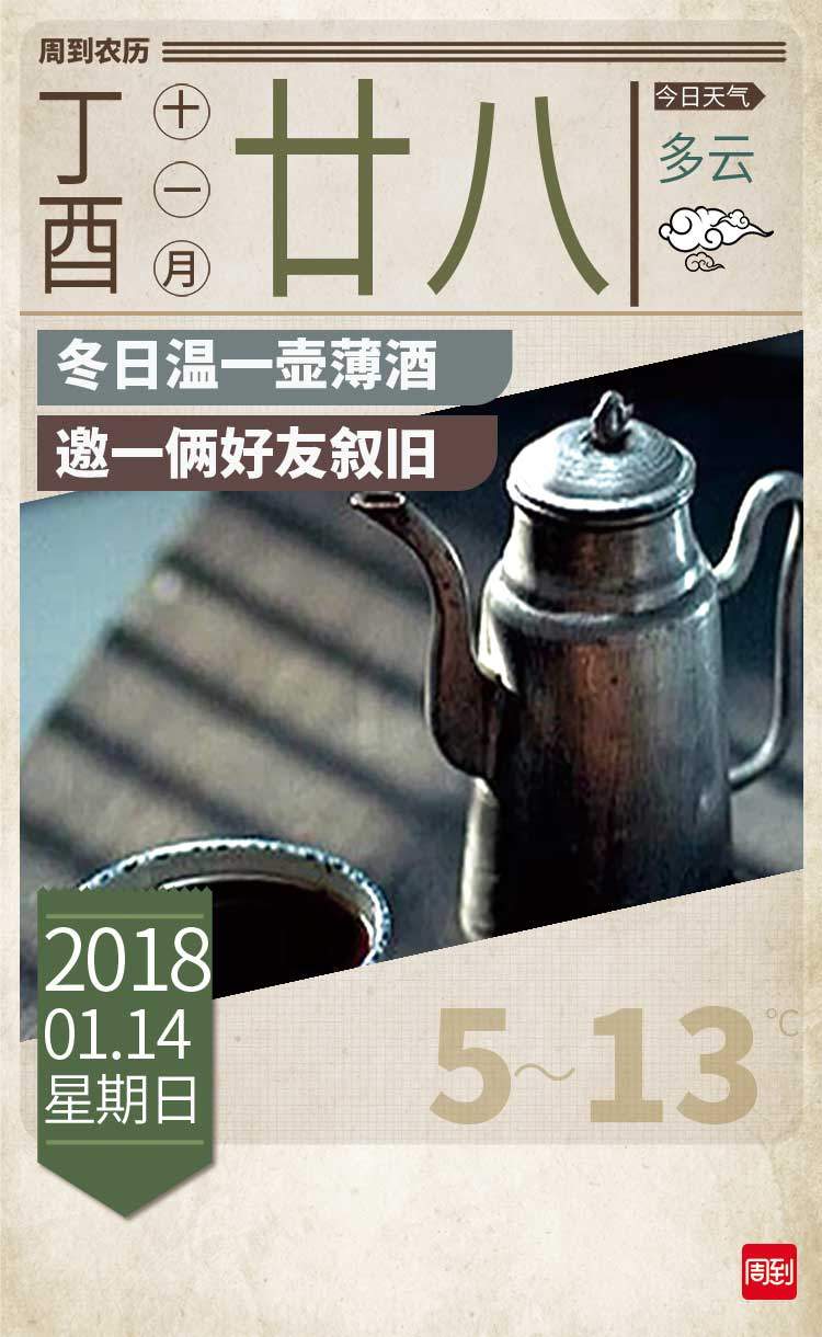 农历中国 | 十一月廿八 · 温酒叙旧 2018-1-14 冬日温一壶薄酒 邀一俩好友叙旧 寒冷的冬日, 从前的人早已歇冬。 窗上霜,瓦上雪, 这是隆冬最常见的景致。 炉生火,米粥香, 这是家家户户最平常的时光。 闲来无聊的日子, 冬日的时间过得很慢很慢… 所以,古人喜欢在这样的日子, 取出立冬酿的米酒, 温一壶薄酒, 备上几碟下酒的小菜, 邀约一俩好友叙旧。 任凭窗外漫天飞雪, 朋友间围着火炉, 品着小酒, 聊天谈心, 或吟诗赏画, 好一派精雅的旧时生活图景。 唐代诗人白居易有诗曰: 绿蚁新醅酒, 红泥小火炉。 晚来天欲雪, 能饮一杯无? 赞一个 (0)