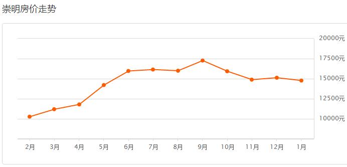 崇明1月二手房均价14774元/m²崇明12月二手房均价15127元/m²环比上月下跌2.33% ↓,同比去年同期上涨38.46% ↑