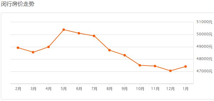 闵行1月二手房均价47402元/m²闵行12月二手房均价47051元/m²环比上月上涨0.75% ↑,同比去年同期下跌2.60% ↓