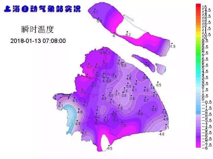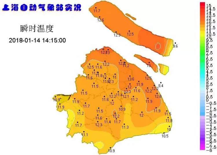 气温触底反弹,本市气温实况图也从昨天的冷色调变成今天午后的暖色调。