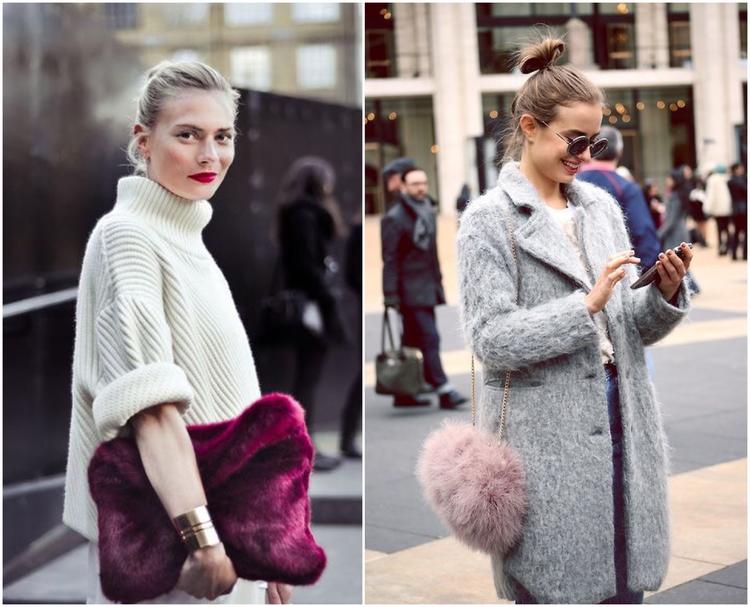 如果还是觉得皮草过于高调或者上身显胖,可以来点小小的毛毛配饰点缀提亮下全身单调的look,比如毛毛帽、耳环、包包、挂扣等 ↓