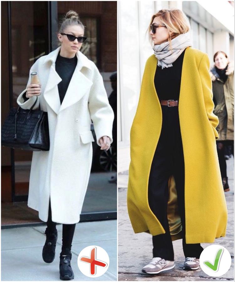 这里我们要注意的几点就是:长外套穿上身千万别合上,这样就看不到你的腰线在哪里,Gigi 178cm的身高,左下图的她看起来只有168cm,但右下图她的外套不仅是打开的,而且腰带的位置也准确的告诉了大家自己的腰线在哪里,视觉效果上拉长了自己的下半身。↓