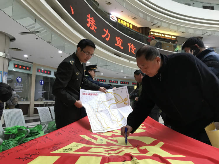 19日当天下午,宣传小组来到上海客运汽车总站,开展“春运回乡路,平安伴你行”万人签名活动,向务工人员发放回乡地图等宣传资料。