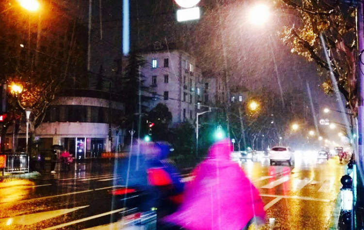 1 月份的一场雪,是雷声大雨点小,断断续续地飘了一些雪花,不久就嘎然而止。图为在风雪中的行人和路灯。