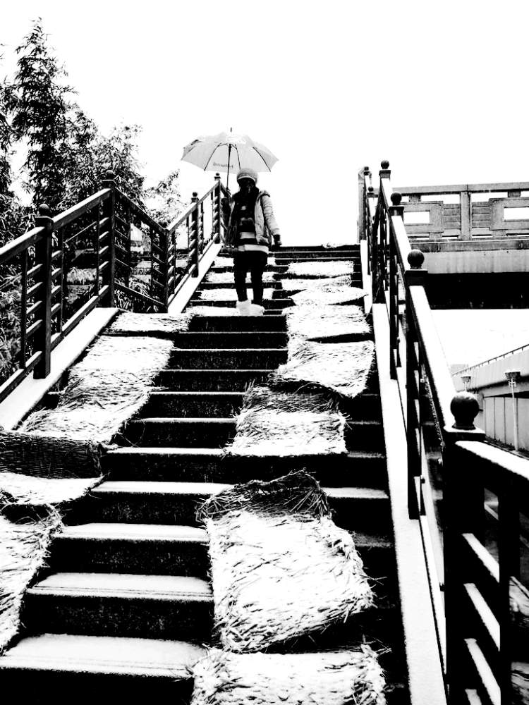 为了防止行人在雪地上滑倒,有关部门在古北路桥上放了草垫方便出行。
