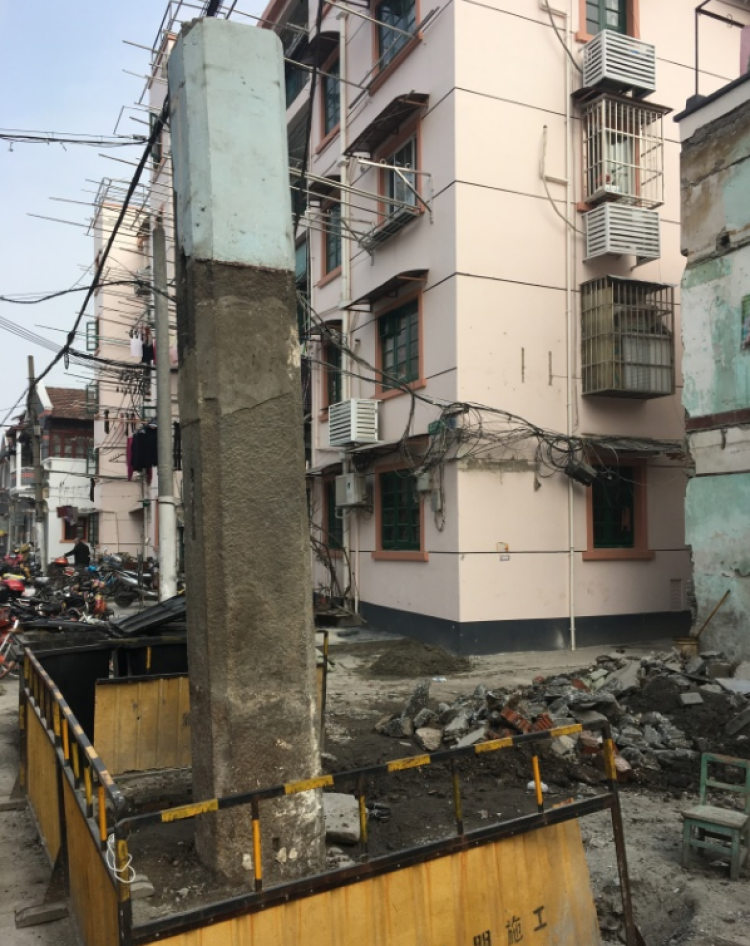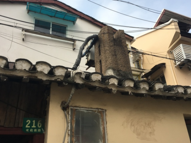 而另一根石柱依旧仍然被包裹在旧房中。周到君看到,石柱露出一头,像个烟囱。石柱顶端还安装了一个空调外机,空调的一根出水管从外机延伸下来,伸入旧房中。该旧房还未拆,门牌号显示“光启南路216号”。它露出的部分,也凿出了类似“榫眼”。