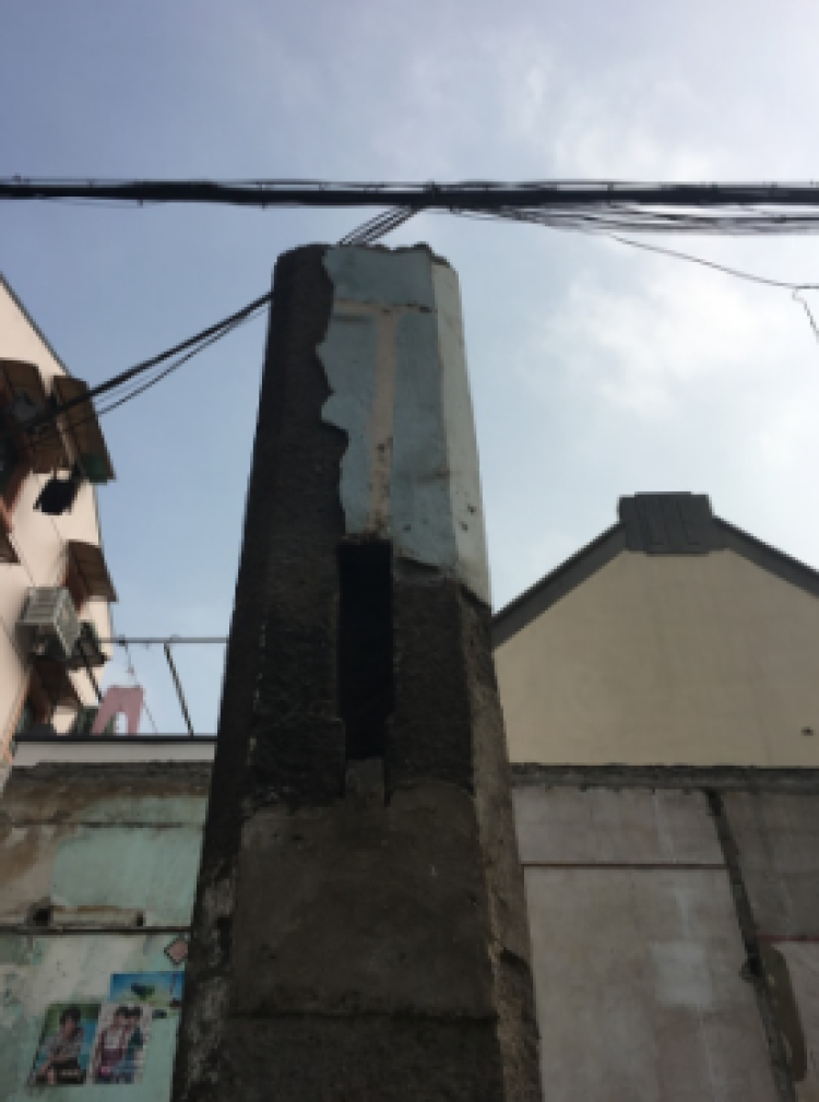 周到君闻讯后立即赶到光启南路,老远就看到两根粗大的石柱,走近一看,石柱边长约60厘米,高约5米,分别位于光启南路两侧,其中一根已完全暴露出来。周到君仔细观察,石柱四周有多个“榫眼”,顶端部分有水泥痕迹,外层刷了淡蓝色,可能是石柱被“纳入”房子时被当作屋内构件而涂的粉刷。