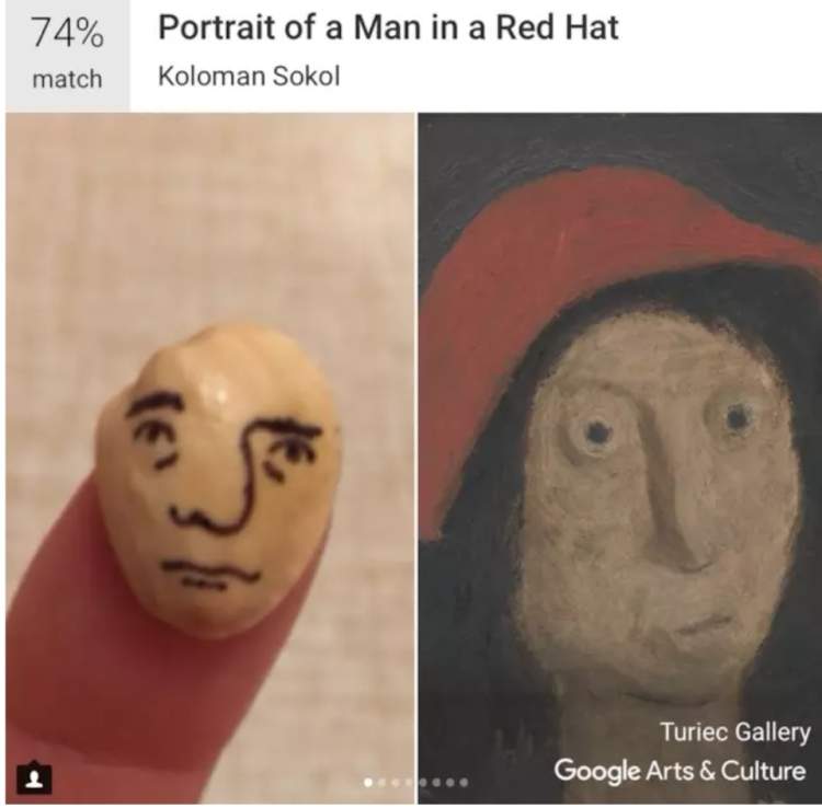 这位喜欢在开心果上画人脸的网友,成功地匹配到了一幅匹配度高达74%的画作——斯洛伐克画家Koloman Sokol创作的《Portrait of a Man in a Red Hat》。灵魂画手们,你们可是能找到自己的灵魂伴侣了!