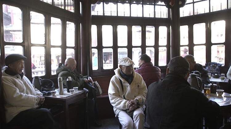 他住在豫园商城附近,每天早上都步行到湖心亭,喝杯茶再回去。