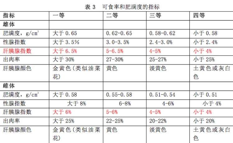 蟹按重量被分成5个规格,蟹越重标志着规格越高,这就是为啥一般情况大蟹总比小蟹贵的原因。当然,蟹大但“里面一泡水”自然不是好蟹,也就是说,光看重量来判别蟹的好坏是不行的,判别蟹的好坏,重量是必要条件。规格重量比较科学的判别就是用肥满度指标来表征(见表),肥满度就像比重,同样规格大小的蟹,体重越重,肥满度就越高,质量就越好。所以大闸蟹的“美”以肥为“美”,“苗条”的蟹质量就不好了。