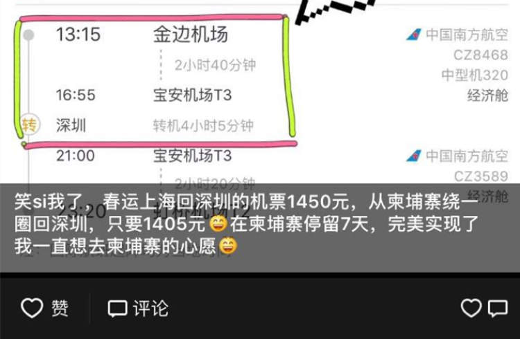 近日,市民刘小姐告诉记者她原本打算直接购买2月中上旬上海虹桥直飞深圳宝安的机票,“结果用APP一搜,价格都在1500元上下,真的不划算。”后来刘小姐无意间发现如果从柬埔寨绕一圈回深圳,只要1405元,“这样就打算在柬埔寨停留7天,完美实现我一直想去柬埔寨的心愿。” 刘小姐说道。