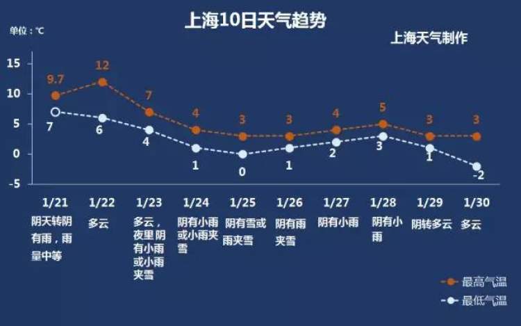 第二周:8日开始的一周,北方强冷空气南下影响,本市气温连创新低,天气转为持续晴冷,过程中徐家汇最低气温降至-2.8℃;