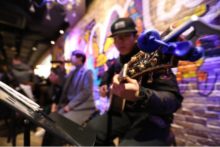 平时周末的夜晚,经常有乐队来这里驻唱。歌手和乐手大部分是高校的学生。周到君去的当天,驻唱的小姐姐自我介绍说是复旦的博士在读生呢~