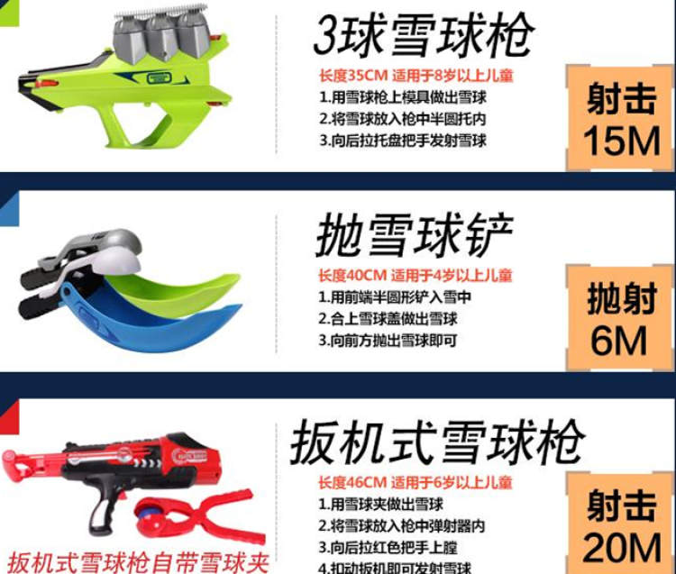 某宝上各种造型的雪球发力枪有扳机式也有弹弓式,还有简易的抛雪球铲,射程威力不容小觑哦。