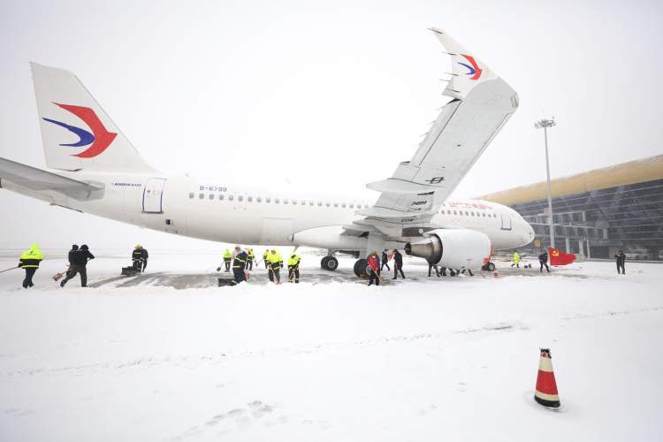 ■东航在合肥机场给飞机除雪