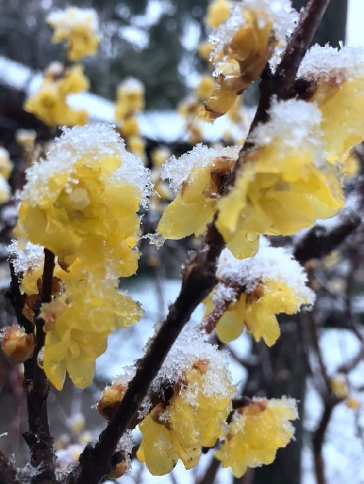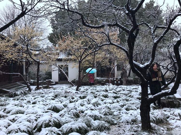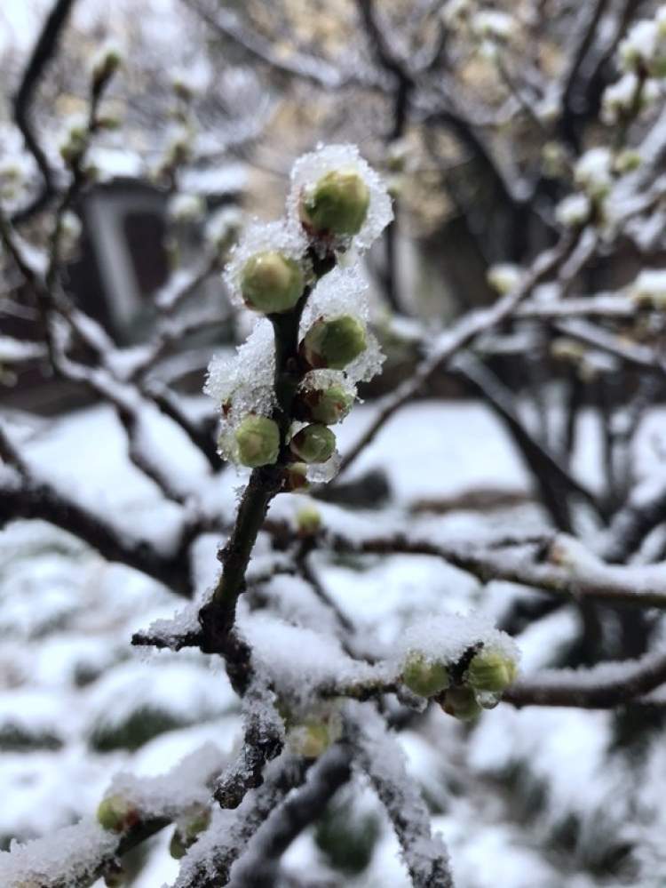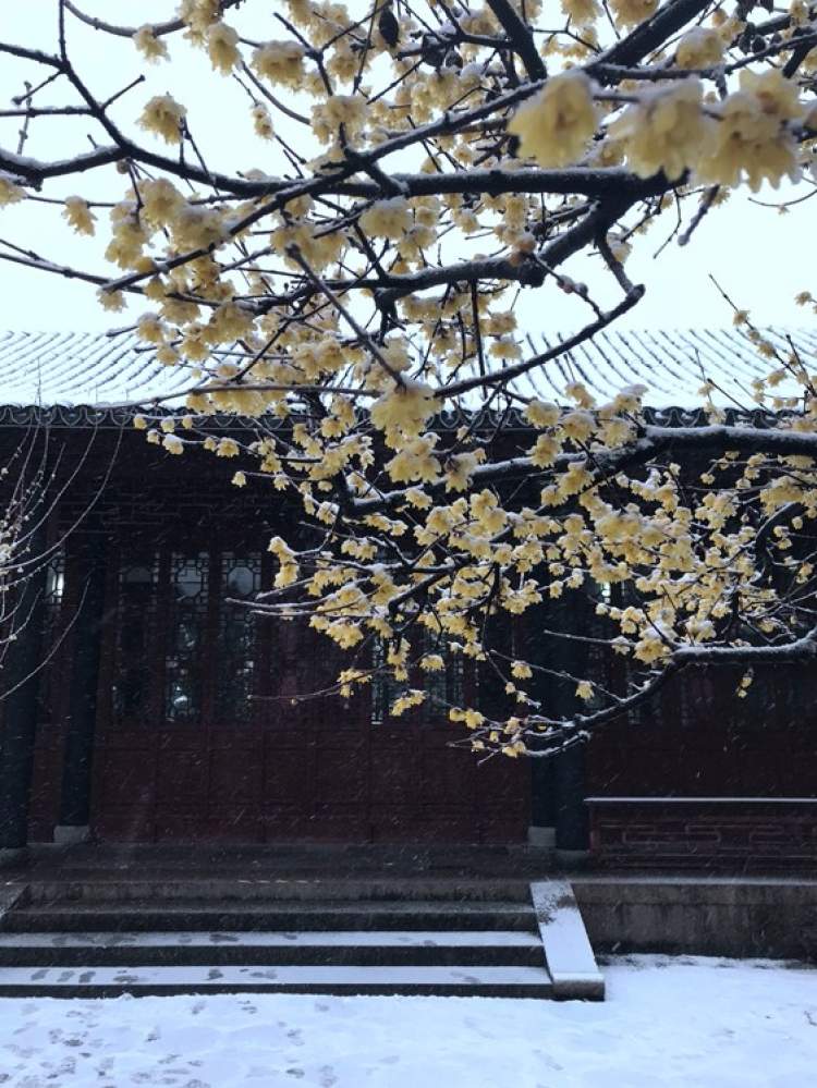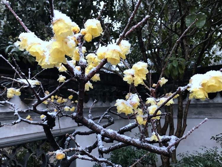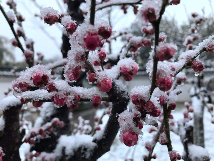 目前,腊梅花正值花期。花瓣蜡黄娇嫩,覆盖着一层薄薄的冬雪,显得格外俊俏。红梅的花苞也在绽开,工作人员说,如果这场雪再迟来十天,就一定能够营造出红梅白雪的琉璃世界。青梅则稍显寂寞。枝头的花苞已经结成,只是尚小,看上去颇像叶芽。